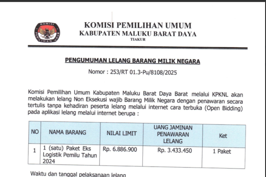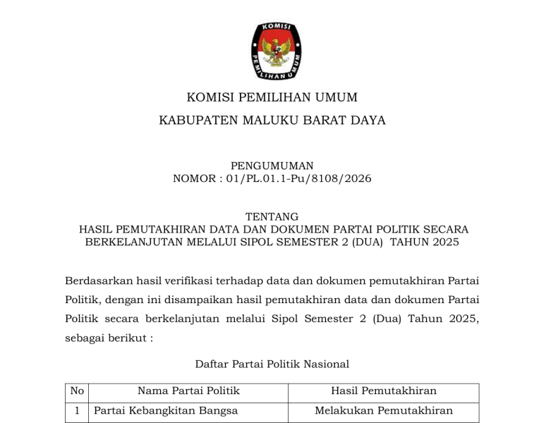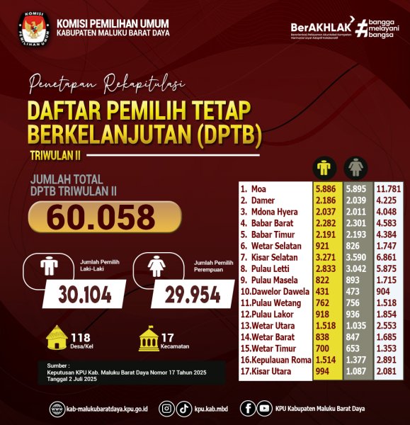 Rekapitulasi Pemutakhiran Data Pemilih Berkelanjutan (PDPB) Triwulan III Tahun 2025 Tingkat Kabupaten Maluku Barat Daya. Pengumuman PDPB Triwulan III Tahun 2025 Disini Berita Acara tentang Rekapitulasi Pemutakhiran Data Pemilih Berkelanjutan (PDPB) Triwulan III Tahun 2025 Disini SK Nomor 22 Tahun 2025 tentang Rekapitulasi Pemutakhiran Data Pemilih Berkelanjutan (PDPB) Triwulan III Tahun 2025 Disini