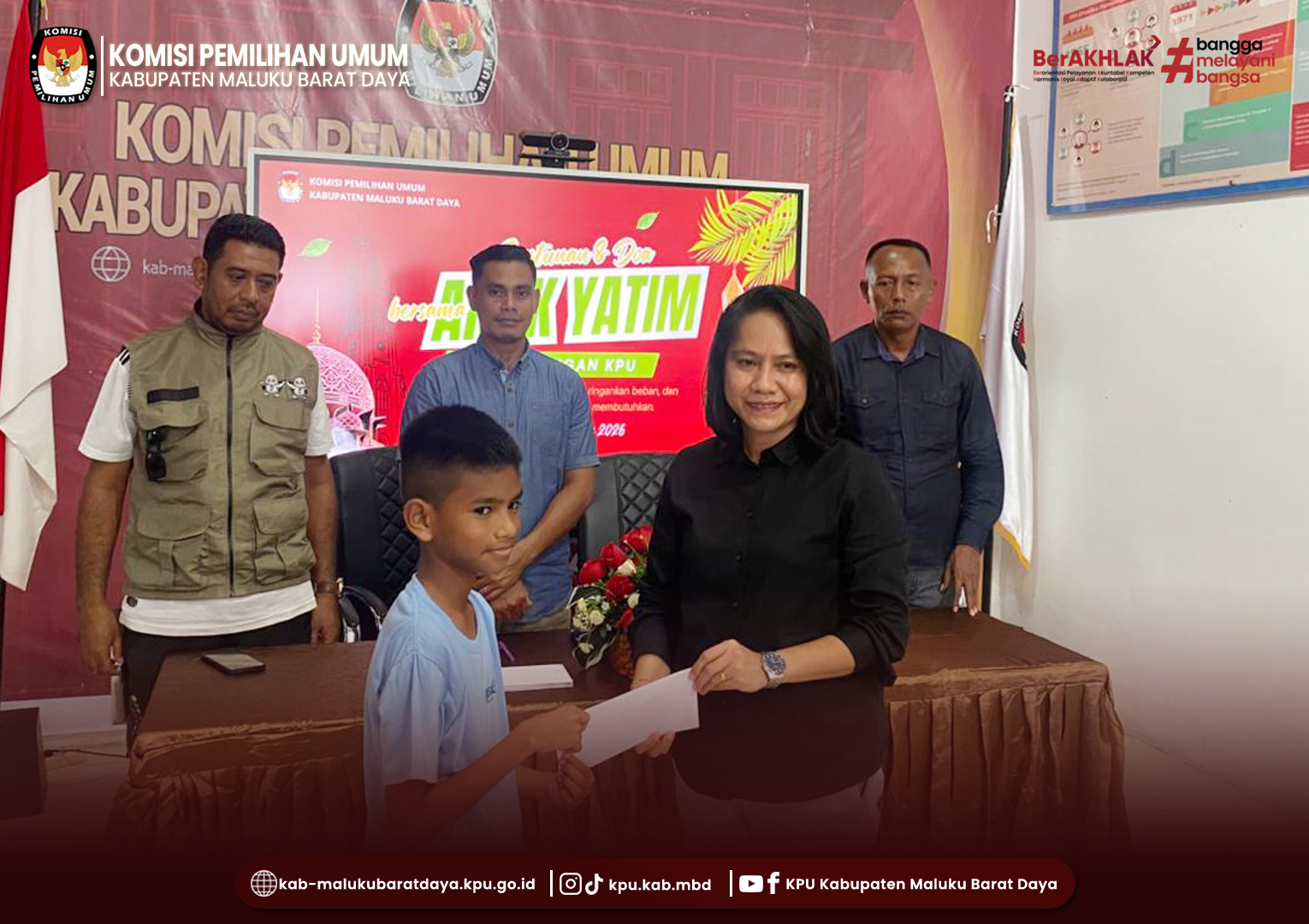 Penyerahan santunan dilakukan oleh Ketua dan anggota KPU Kabupaten Maluku Barat Daya kepada 10 anak yatim berdomisili di sekitar lingkungan kantor KPU Kabupaten Maluku Barat Daya.