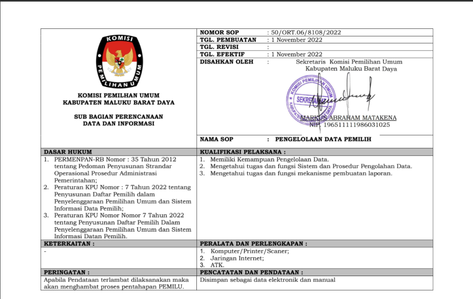 SOP DATA PEMILIH Selasa, 01 November 2022 11:25 48 Standard Operating Procedure Teknis Pembuatan dan Pengelolaan Materi dalam Akun Laman Resmi dapat diunduh disini Baca Selengkapnya