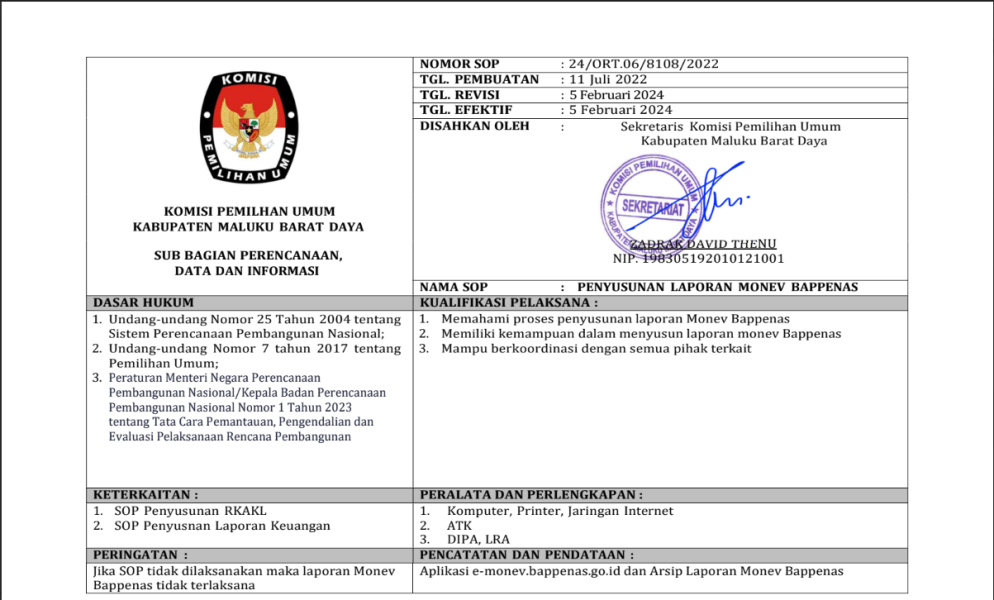 SOP Penyusununan Laporan Moniv BAPPENAS Senin, 05 Februari 2024 11:10 77 SOP Penyusunan Laporan Moniv BAPPENAS dapat diunduh Disini Baca Selengkapnya