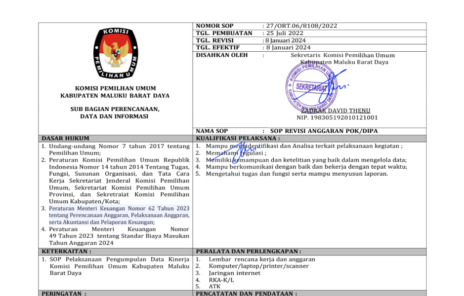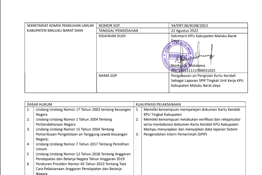 SOP Pengawasan Pengisian Kartu Kendali sebagai Laporan SPIP TIngkat Unit Kerja KPU Kab. Maluku Barat Daya Senin, 22 Agustus 2022 22:11 82 SOP Pengawasan Pengisian Kartu Kendali sebagai Laporan SPIP TIngkat Unit Kerja KPU Kab. Maluku Barat Daya dapat diunduh disini Baca Selengkapnya