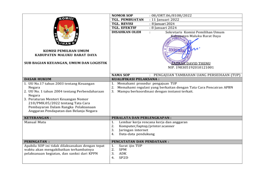 SOP Pengajuan Tambahan Uang Persediaan (TUP) Senin, 08 Januari 2024 11:23 63 SOP Pengajuan Tambahan Uang Persediaan (TUP) dapat diunduh disini Baca Selengkapnya