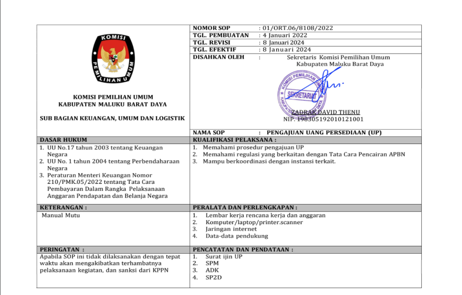 SOP Pengajuan Uang Persediaan (UP) Senin, 08 Januari 2024 11:29 96 SOP Pengajuan Uang Persediaan (UP) dapat diunduh disini Baca Selengkapnya