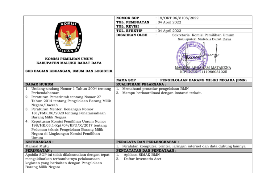 SOP Pengelolaan Barang Milik Negara (BMN) Senin, 04 April 2022 10:22 179 SOP Pengelolaan Barang Milik Negara dapat diunduh Disini Baca Selengkapnya
