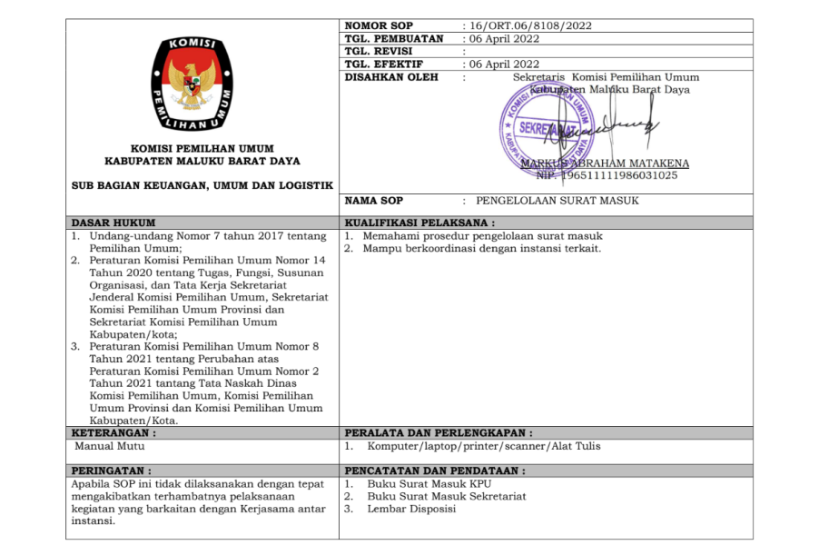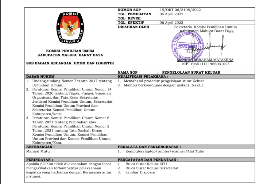 Surat Keputusan SOP Pengumpulan Data Kinerja dilingkup Sekretariat KPU kabupaten Maluku Barat Daya Senin, 07 Februari 2022 11:12 78 Surat Keputusan SOP Pengumpulan Data Kinerja dilingkup Sekretariat KPU kabupaten Maluku Barat Daya dapat diunduh disini Baca Selengkapnya